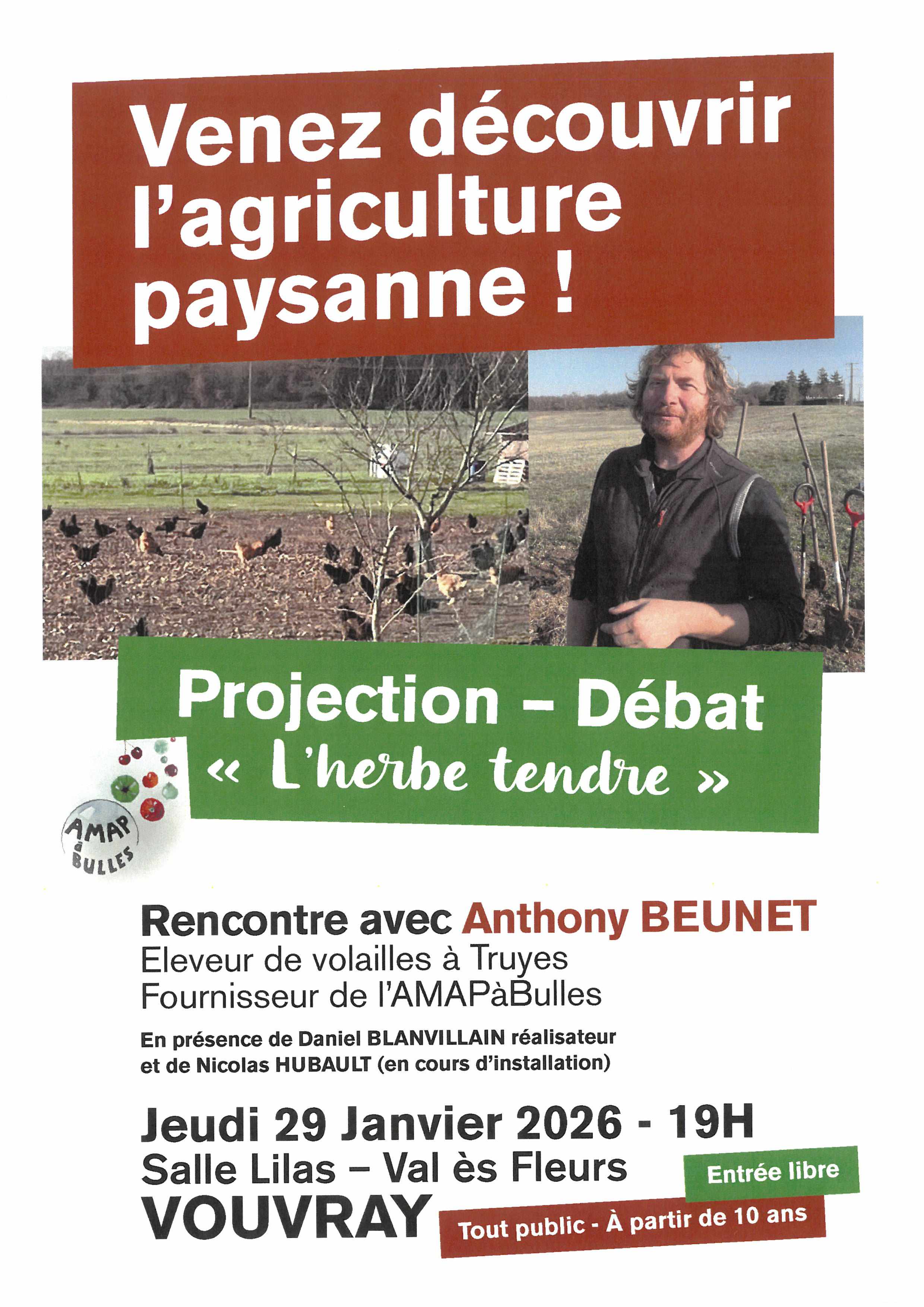 En présence de Daniel BLANVILLAIN (réalisateur), Anthony BEUNET (éleveur de volailles à Truyes et fournisseur de l'AMAP à bulles) et Nicolas HUBAULT (en cours d'installation)