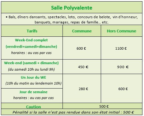 Elle dispose d'une scène, de sanitaires dans le hall d’entrée et d'une cuisine.