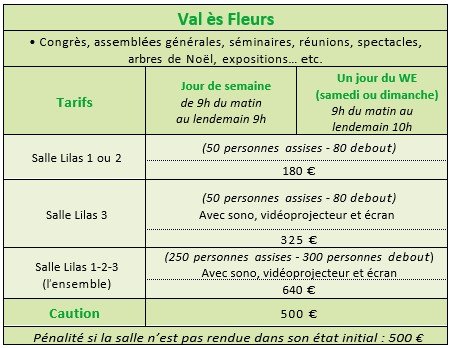 Le bâtiment Val ès Fleurs comporte une salle dite “Lilas” pouvant se scinder en 3 salles à l’aide de cloisons modulaires. Celles-ci sont dépourvues de cuisine. Plus adaptées pour des expositions, séminaires, congrès, assemblée générale, réunions, spectacles, arbres de noël d’entreprise…etc, elle dispose d’un écran, d’une connexion filaire Internet, d’un vidéoprojecteur, d’une sono pour micro, d’un lecteur DVD et d’une scène.